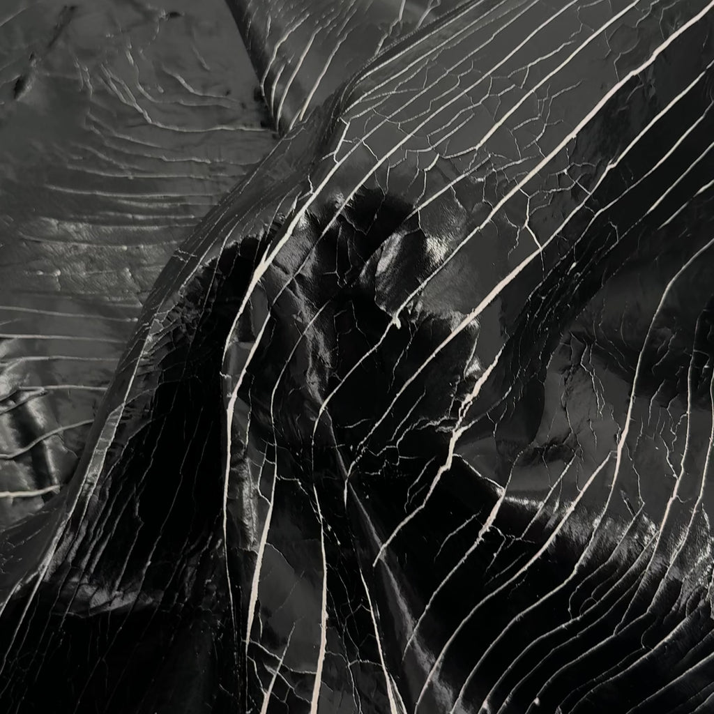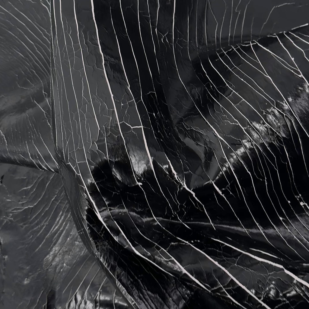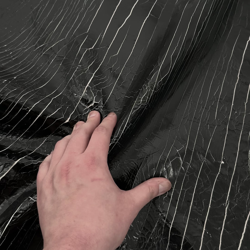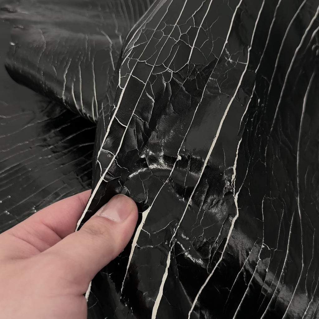 Shatter Lamb is a distinctive lambskin featuring a fractured black foil finish set against a contrasting white suede base. The foil is intentionally cracked across the surface, creating a unique pattern and texture on every skin. As it wears, the foil gradually reveals more of the natural crust beneath, enhancing its character and giving the leather an authentic, worn-in vintage appeal.