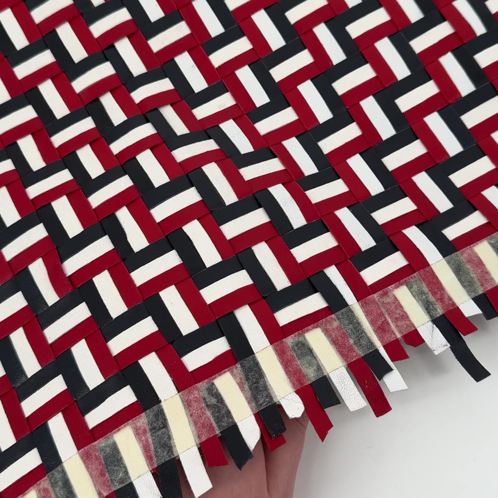 Hand-woven in NYC, these panels are one-of-a-kind and will not be restocked. Panels come taped on the edges to prevent unraveling. To correctly use these panels, either stitch or tape down the edges of the pattern pieces you are cutting prior cutting to prevent having to re-weave any strips.